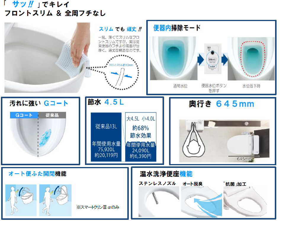 フロントスリム&まる見えフチなし もっともお手入れのしにくい便器手前のフチを限界まで薄くした独自の「フロントスリム」、汚れを隠さず、お掃除はつまんで「サッ」とひと拭きです。周囲のフチは、まる見えにしたことで、気づいたその場で簡単にお掃除ができます。