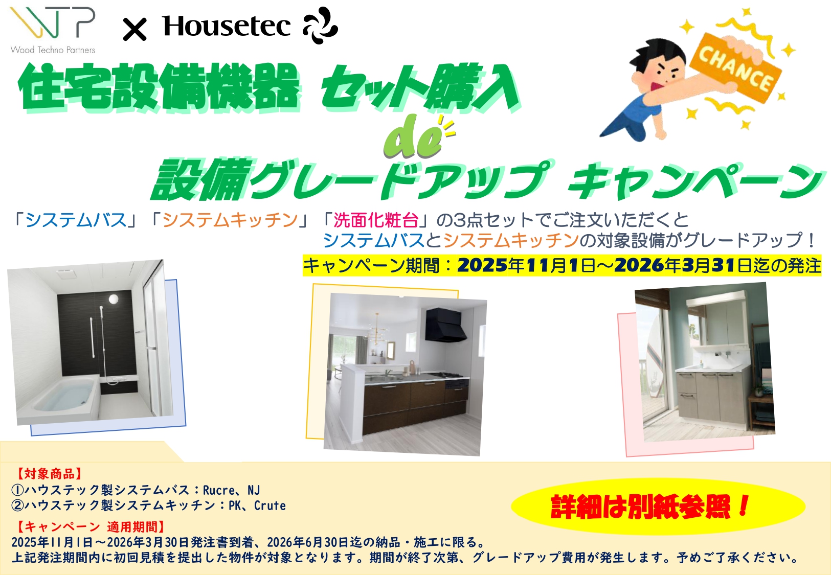 ハウステック商材、ユニットバス(UB)+システムキッチン(SK)+洗面化粧台の 3 点セットで
