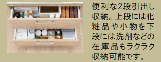清掃性に優れた一体型カウンターと収納力抜群の2段引き出しキャビネット